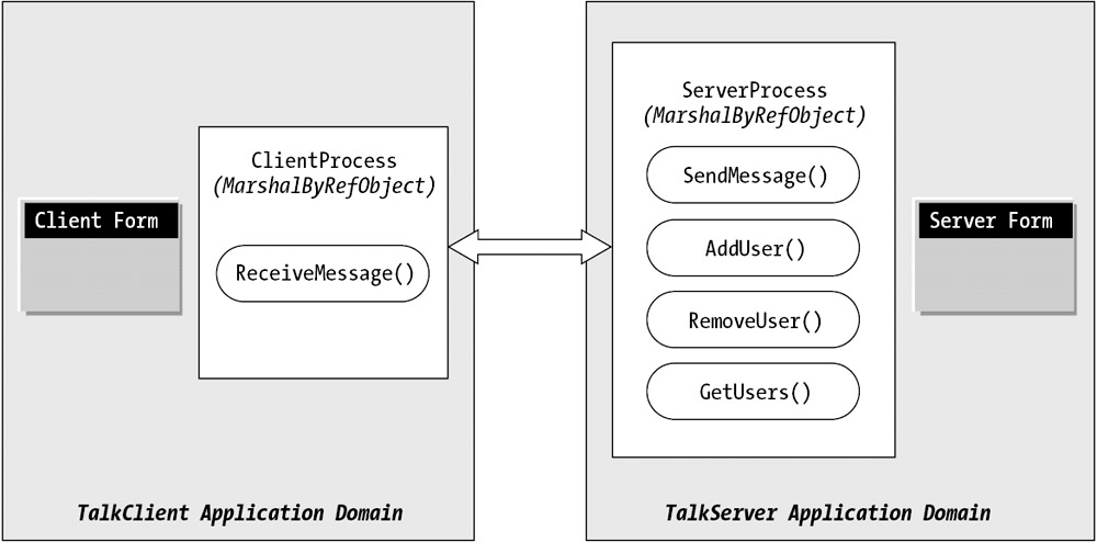 ITalkServer defines the basic AddUser() and RemoveUser() methods for registering and unregistering users. It also provides a GetUsers() method that allows peers to retrieve a complete list of online users, and a SendMessage() method that actually routes a message from one peer to another. When SendMessage()is invoked, the server calls the ReceiveMessage() method of the ITalkClient interface to deliver the information to the appropriate peer.