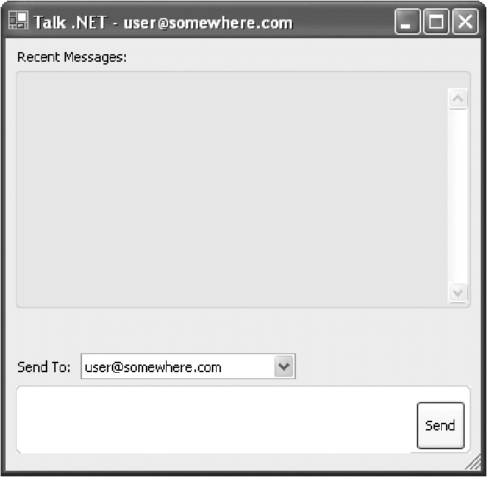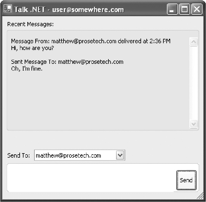 The client portion of Talk .NET is called TalkClient. It's designed as a Windows application (much like Microsoft's Windows Messenger). It has exactly two responsibilities: to allow the user to send a message to any other online user and to display a log of sent and received messages.