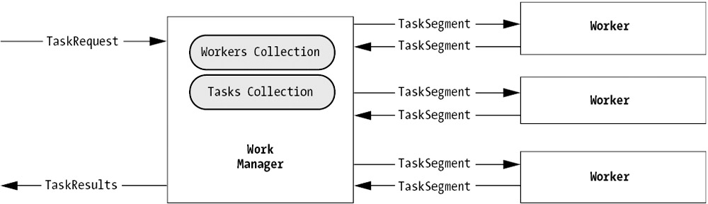 The work manager divides the work into segments and sends available workers a TaskSegment object with a part of the work.