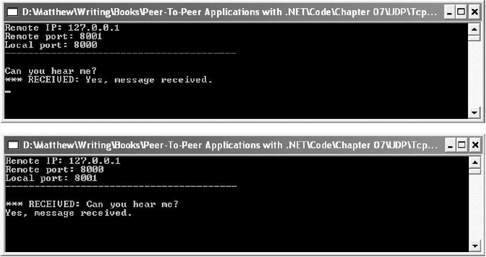 If you start two instances of the UDP test application, you might have an exchange such as the one shown in Figure 7-6. In this example, both instances are on the local computer. They differ only in the port that they're using.