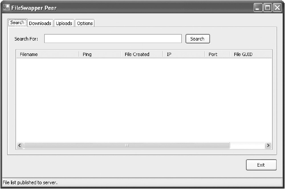 The FileSwapper application is built around a single form (see Figure 9-1). This form uses multiple tables and allows users to initiate searches, configure settings, and monitor uploads and downloads.
