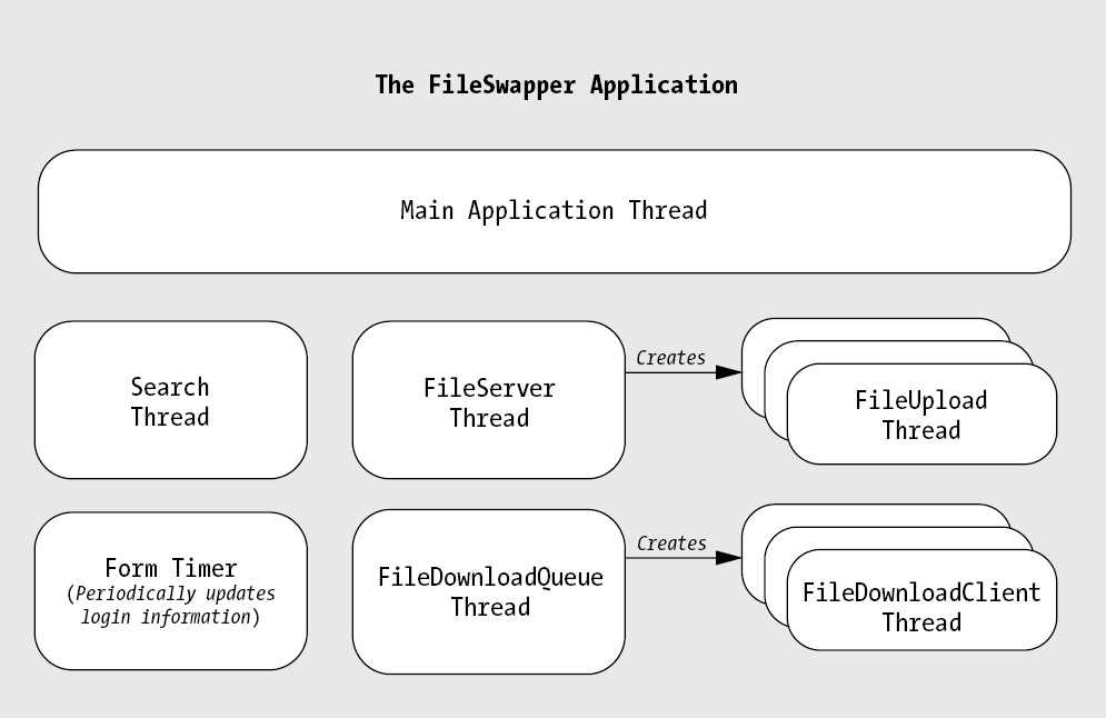Figure 9-2 shows a simplified view of threads in the FileSwapper application. Note that for the most part, independent threads run code in separate objects to prevent confusion. However, this isn't a requirement, and a single object could be executed on multiple threads or a single thread could run the code from multiple objects.