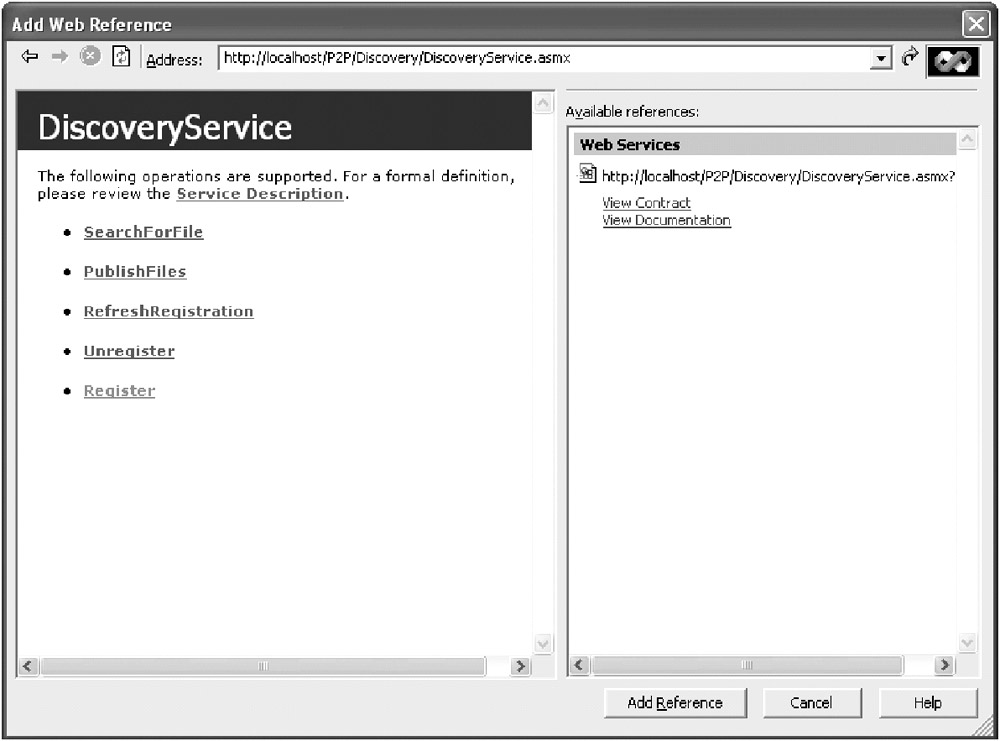 The FileSwapper requires a web reference to the discovery service in order to work. To add this, right-click the project name in the Solution Explorer, and choose Add Web Reference. Type the full path to the virtual directory and web service .asmx file in the Address field of the Add Web Reference window. When you press Enter, the list of web-service methods from the Internet Explorer test page will appear, as shown in Figure 9-3.