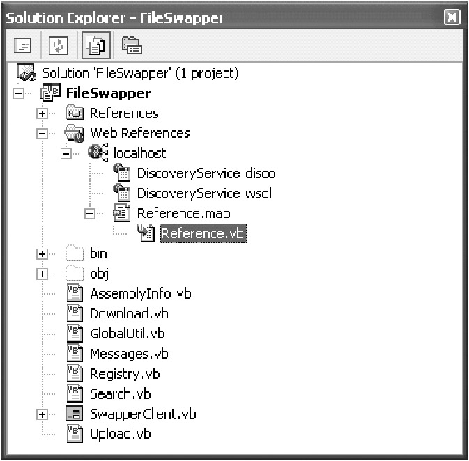 Show All Files from the Visual Studio .NET window. The proxy class is always named Reference.vb, as shown in Figure 9-4. We won't consider the proxy class code in this book, although it makes interesting study if you'd like to understand a little more about how web services convert .NET objects into SOAP messages and back.