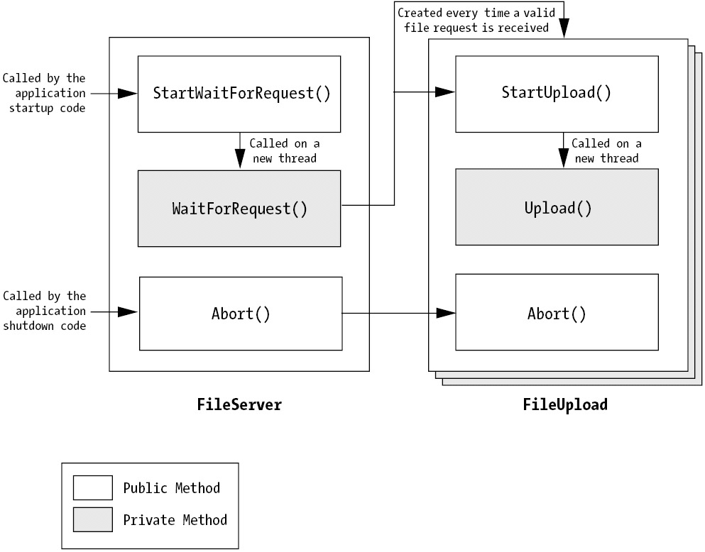 This framework is shown in the following code listing. One of the differences you'll notice is that an additional member variable is used to track individual upload threads. The Abort() method doesn't just stop the thread that's waiting for connection requests—it also aborts all the threads that are currently transferring files.