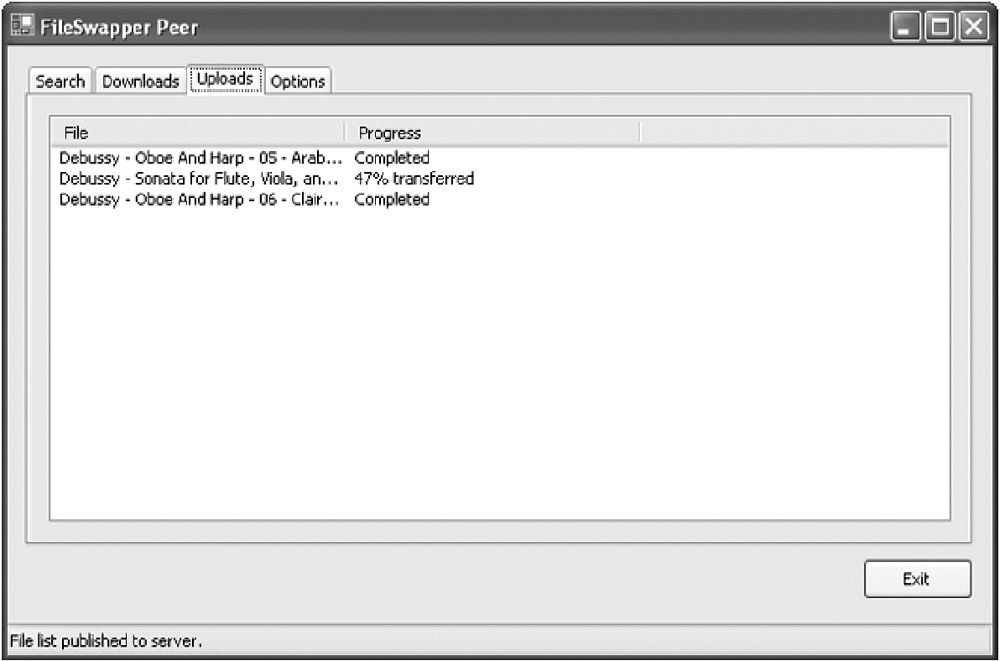 The FileUpload class uses the same thread-wrapping design as the FileServer and Search classes. The actual file transfer is performed by the Upload() method. This method is launched asynchronously when the FileServer calls the StartUpload() method and canceled if the FileServer calls Abort(). A reference is maintained to the ListView control with the upload listings in order to provide real-time progress information.