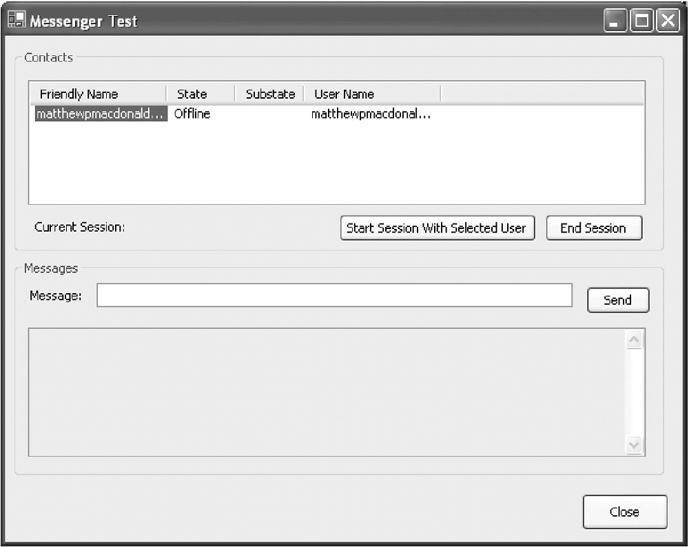 Figure 12-1 shows the client we'll create to demonstrate the MSNP component. It allows a user to log in, see other contacts, start a session, and send messages.