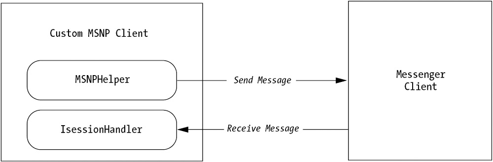 In order to send and receive messages with the MSNP component, you must create a class that implements the ISessionHandler interface. As part of this interface, you'll need to implement methods such as MessageReceived() and ErrorReceived(). These methods will be triggered by the MSNP component in response to messages received from the Messenger network. (A more typical way to implement this type of design is to use events. However, this approach is equivalent.)
