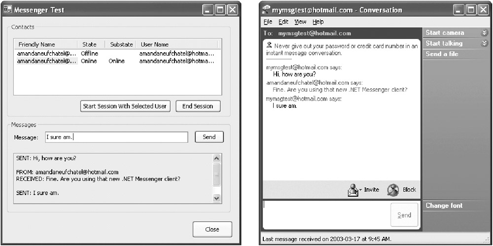You start a session with one of your Messenger contacts. A session can be thought of as a separate chat window in the Messenger application. Before you can send messages to any user, either you (or the recipient) must start a session by opening a chat window. You can also create multiple sessions at once (although our simple example won't use this feature). Whenever a session is established, the contact list is updated.