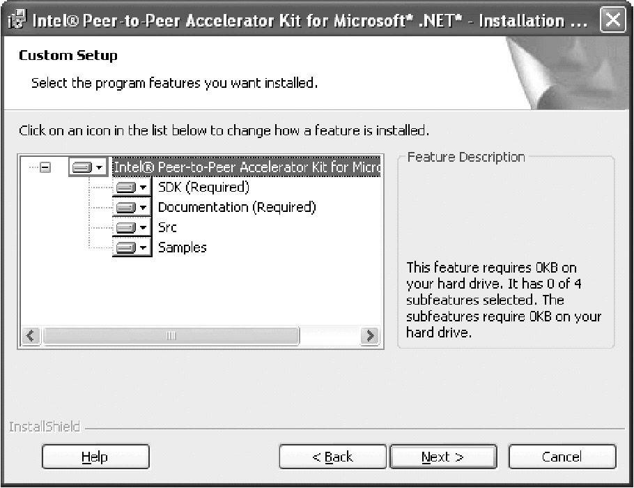 The Intel Peer-to-Peer Accelerator Kit download is in the form of a ZIP file with two setup applications. One allows you to install the peer-to-peer name server (used for discovery), while the other includes the Peer-to-Peer Accelerator Kit, which includes the required assemblies, documentation, and optionally, several sample applications and the source code for the toolkit (see Figure 13-4).