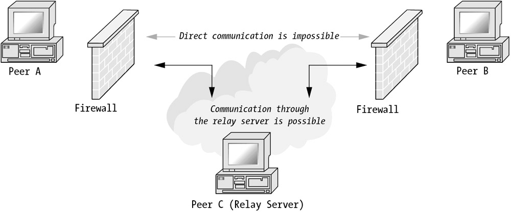 Finally, the relay and tunnel elements allow you to set up firewall traversal solutions. The relay element allows you to configure a peer to act as a relay server (or "super peer") that takes additional responsibility for transmitting messages between peers that could not otherwise communicate, as shown in Figure 13-5.
